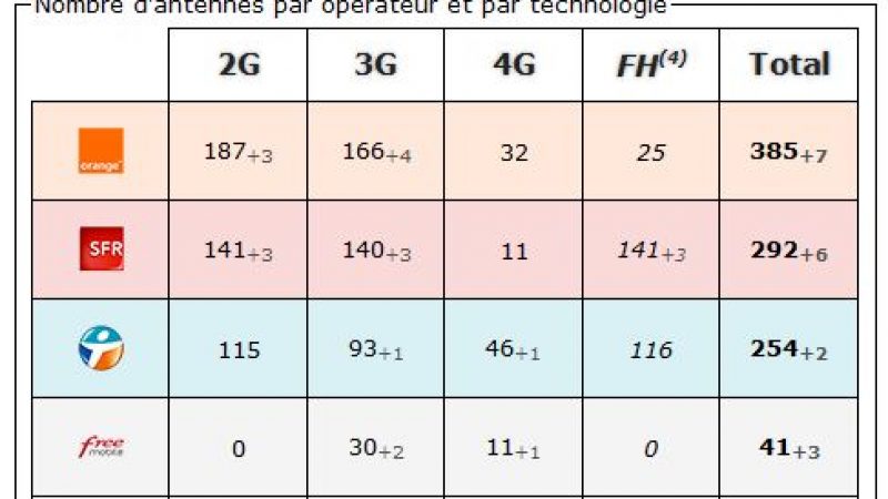 4) FH (faisceau hertzien) : Système de transmission entre les antennes relais. N’est jamais directement capté par un mobile. (chiffre non comptabilisé dans le total des antennes).