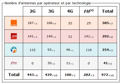 4) FH (faisceau hertzien) : Système de transmission entre les antennes relais. N’est jamais directement capté par un mobile. (chiffre non comptabilisé dans le total des antennes).