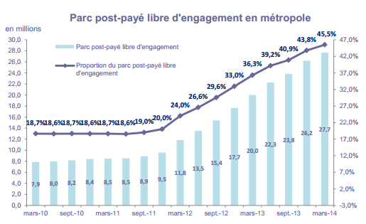 Néanmoins, les Français sont de moins en moins enclins à rester engagés. La part d’abonnés (post-payés) qui n’est plus engagé, ayant soit souscrit un forfait sans engagement, soit étant arrivé à son terme, a progressé de 9 points en un an et atteint désormais 45 % du parc d’abonnés en France métropolitaine.