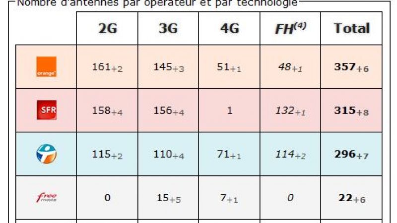 4) FH (faisceau hertzien) : Système de transmission entre les antennes relais. N’est jamais directement capté par un mobile. (chiffre non comptabilisé dans le total des antennes).