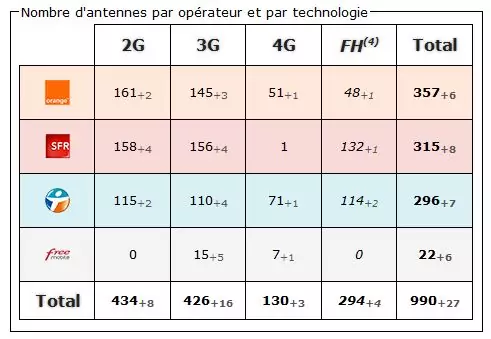4) FH (faisceau hertzien) : Système de transmission entre les antennes relais. N’est jamais directement capté par un mobile. (chiffre non comptabilisé dans le total des antennes).