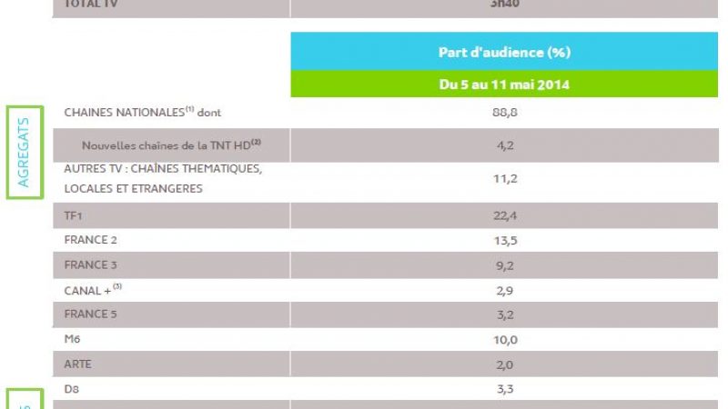 Du 5 au 11 mai 2014 la durée d’écoute est de 3h40. Les chaînes nationales (1) y compris les chaînes TNT comptabilisent 88.8 % de part d’audience alors que les autres réunissent 11.2%. TF1 arrive largement en tête avec 22,4% suivi de France 2 (13.5%) et de M6 (10%) qui arrive juste devant France 3 (9.2%). En queue de peloton des chaînes TNT on retrouve 6TER (0.8%) et NUMERO 23 avec 0.5% de part d’audience.