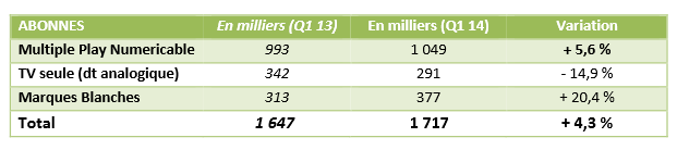 A la fin du premier trimestre 2014, le Groupe comptait plus de 336 000 abonnés équipés avec LaBox Fibre, soit environ 32% de son parc Multiple Play. Malgré la baisse des abonnés monoplay TV (abonnés ne recevant que la télévision), Numericable voit sa base de clients augmenter de 70 000 au premier trimestre 2014. Ce rythme de croissance annuel est en ligne avec l’objectif du Groupe d’augmenter sa base de clients de 200 000 à 250 000 sur la période 2014-2016.