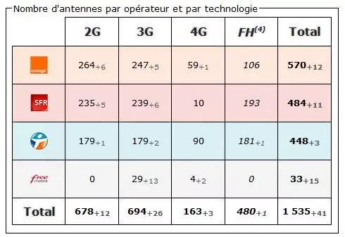 4) FH (faisceau hertzien) : Système de transmission entre les antennes relais. N’est jamais directement capté par un mobile. (chiffre non comptabilisé dans le total des antennes).