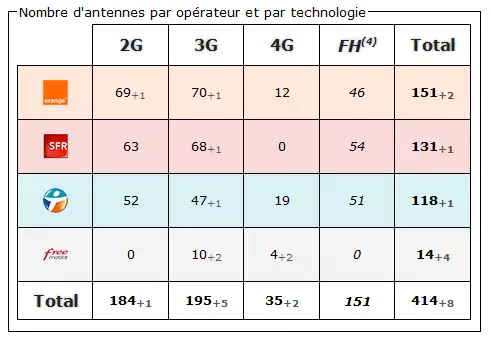 4) FH (faisceau hertzien) : Système de transmission entre les antennes relais. N’est jamais directement capté par un mobile. (chiffre non comptabilisé dans le total des antennes).