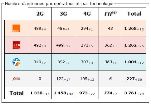 4) FH (faisceau hertzien) : Système de transmission entre les antennes relais. N’est jamais directement capté par un mobile. (chiffre non comptabilisé dans le total des antennes).