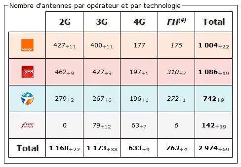 4) FH (faisceau hertzien) : Système de transmission entre les antennes relais. N’est jamais directement capté par un mobile. (chiffre non comptabilisé dans le total des antennes).