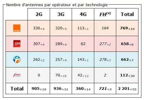 4) FH (faisceau hertzien) : Système de transmission entre les antennes relais. N’est jamais directement capté par un mobile. (chiffre non comptabilisé dans le total des antennes).