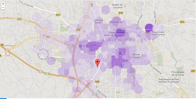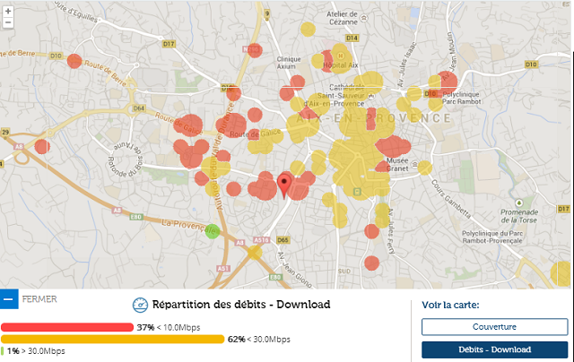 Comme Clermont, si la couverture est au rendez-vous, les débits ne le sont pas, Aix-en-Provence fait néanmoins mieux que son prédécesseur avec 4 à 6 tests très localisés qui ont dépassé les 30 Mbits. Néanmoins, 62 % du territoire testé se situe entre 10 et 30 Mbits en débit descendant.