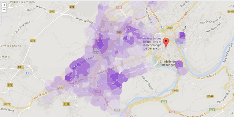 Du côté de Besançon, la ville est partiellement couverte selon les 5 000 mesures réalisées avec l’application Sensorly, certaines zones comme la citadelle ou la rue Thomas Edison reçoivent un signal quasi-parfait, en revanche, entre la rue de Belfort et la rue de l’Aqueduc, aucune couverture 4g n’a été relevée. 12 antennes ont pourtant été déclarées à l’ANFR.