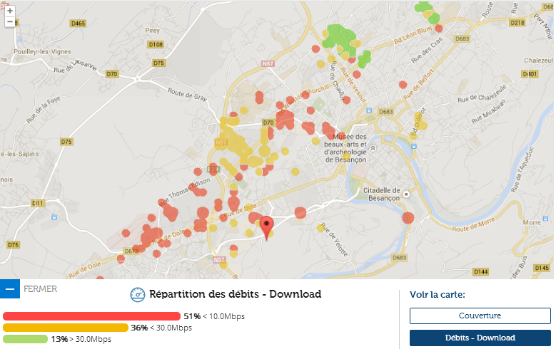 En dehors du quartier de la rue de Vesoul et celui autour du boulevard Leon Blum, aucune autre zone de la ville bisontine ne dépasse les 30 Mbits. La zone entre la Clinique Saint-Vincent et la rue de Dole bénéficie de débit entre 10 et 30 Mbits. En dehors de ces zones, le débit Free Mobile ne dépassera pas les 10 Mbits.