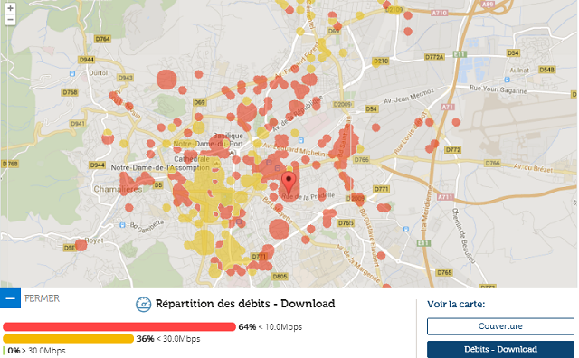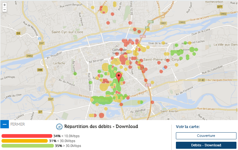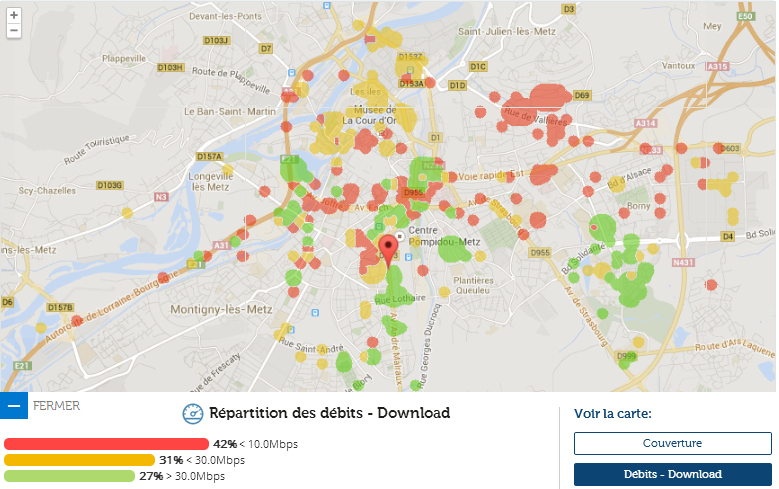En revanche du côté des débits, le bilan est mitigé : un tiers du territoire testé dépasse les 30 Mbits, un autre tiers se situe entre 10 et 30 Mbits, le tiers restant étant limité sous la barre de ces 10 Mbits.