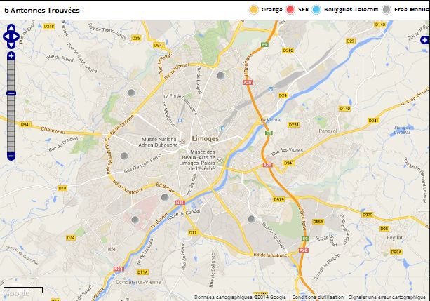 A Limoges, rien à signaler : aucune couverture 4G n’a été relevée. 6 antennes ont pourtant été déclarées et autorisées à émettre en 4G et localisées par le site antennesmobiles.fr.