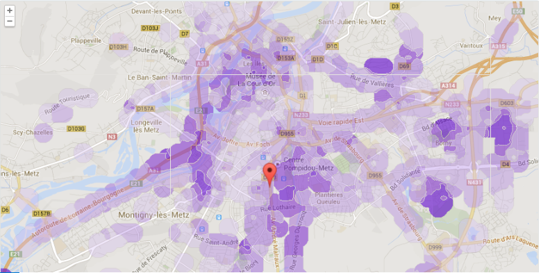 À Metz, 16 antennes déclarées à l’ANFR, assurent ou sont sur le point d’assurer la couverture 4G de la ville Mosellanne. Cette dernière affiche des trous et des pics de couverture, la ville présentant aussi bien des zones sans signal relevées, que des signaux assez larges avec 4 barres de signal.