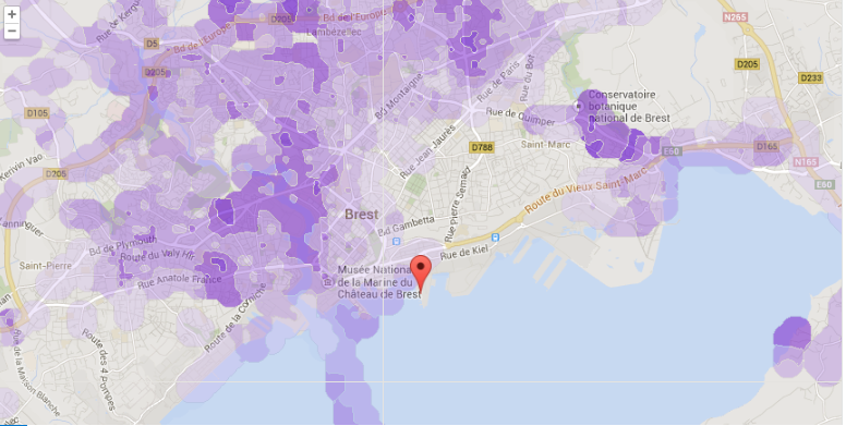 La couverture affiche de nombreux points à 4 barres de réception de la 4G. Certains marins sur le départ ont même pu profiter pendant un certain temps de la 4G après leur départ du port. Seul point noir, l’absence de trace de couverture entre la rue Pierre Sémard et la rue de Quimper.