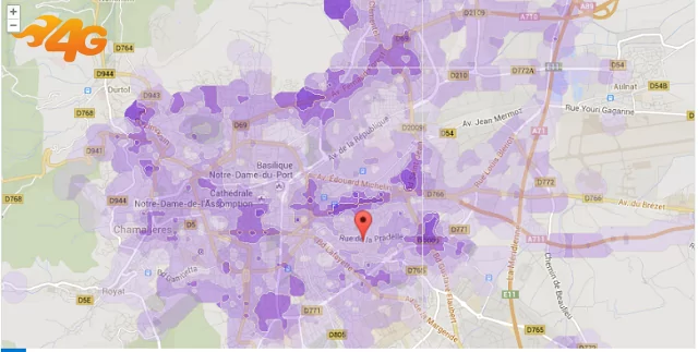 Du côté de Clermont-Ferrand, la ville est, dans l’ensemble, bien couverte en 4G. Avec plus de 100 000 mesures, des traces de couvertures de la 4G Free Mobile, vont jusqu’à Beaumont, Durtol, Cébazat et Pont-du-Château.