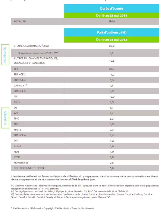Du 19 au 25 mai 2014 la durée d’écoute est de 3h30. Les chaînes nationales (1) y compris les chaînes TNT comptabilisent 89.2 % de part d’audience alors que les autres réunissent 10.8%. TF1 arrive largement en tête avec 22.5% suivi de France 2 (14%) et de M6 (10%) qui arrive juste devant France 3 (9.3%). En queue de peloton des chaînes TNT on retrouve 6TER (0.8%) et NUMERO 23 avec 0.5% de part d’audience.