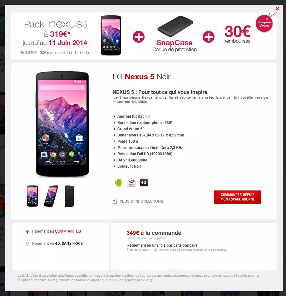 Free Mobile vient de lancer une offre spéciale sur le Nexus 5, valable jusqu’au 11 juin. Le smartphone est ainsi proposé à 349 €, soit le même prix que Google sur le PlayStore mais une offre de réduction de 30€ est également disponible ce qui porte le tarif final à 319€. Un somme qui peut par ailleurs être payée en 4 fois sans frais chez Free Mobile. Et cerise sur la gâteau, la coque officielle du Nexus 5 est offerte.
