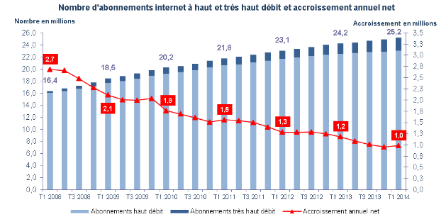 Au cours du premier trimestre 2014, le nombre d’abonnements au très haut débit (débit maximum descendant supérieur ou égal à 30 Mbit/s) a progressé de 155 000 pour atteindre plus de 2,2 millions, soit 505 000 abonnements supplémentaires en un an (+30%). Au sein du total des abonnements à très haut débit, le nombre d’abonnements en fibre optique de bout en bout (640 000 accès fin mars 2014) s’est accru de 69% en un an, soit +260 000 abonnements.
