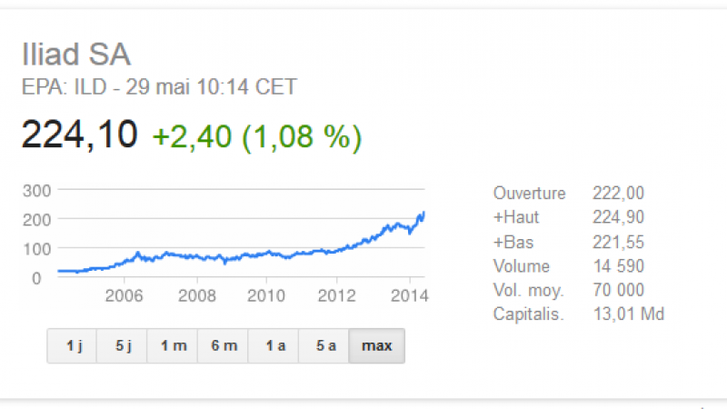 Aujourd’hui, Iliad affiche un nouveau record historique en Bourse. Actuellement, le titre grimpe de 1.01% à 224.10 euros. Au plus haut, l’action du groupe a atteint un nouveau record en séance à 224.90 euros. Ces excellentes performances permettent à la maison-mère de Free et Free Mobile d’être valorisé 13.01 milliards d’euros. Le groupe Iliad est la 32ème capitalisation boursière, largement devant Bouygues (10.82 milliards d’euros) et juste devant Bolloré (12.85 milliards d’euros).
