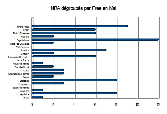 Suite à vos demandes, chaque fin de mois Univers Freebox fera le point sur le nombre réél de NRA dégroupés Free dans toute la France et plus précisément dans votre région, grâce aux données de stats-dégroupage.com. En ce mois de mai, Free a raccordé 84 NRA à son réseau. Petite forme donc pour l’opérateur puisque en avril il en avait dégroupé 149. En voici un comparatif par région.