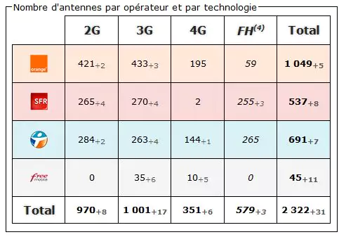 (4) FH (faisceau hertzien) : Système de transmission entre les antennes relais. N’est jamais directement capté par un mobile. (chiffre non comptabilisé dans le total des antennes).