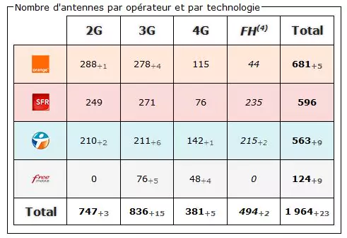 (4) FH (faisceau hertzien) : Système de transmission entre les antennes relais. N’est jamais directement capté par un mobile. (chiffre non comptabilisé dans le total des antennes).