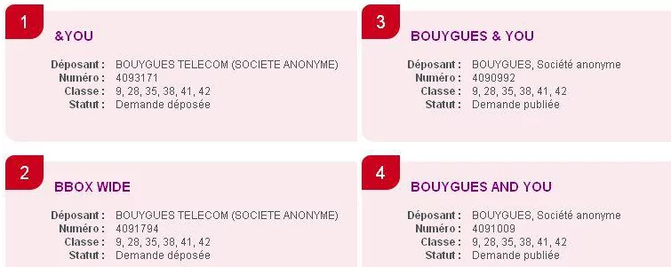 Les sociétés Bouygues et Bouygues Telecom ont récemment déposé plusieurs marques auprès de l’Institut National de la Propriété Industrielle (INPI). Le groupe et l’opérateur ont ainsi déposé les marques « &YOU », « Bouygues & YOU », « Bouygues and YOU » et « Bbox Wide ».