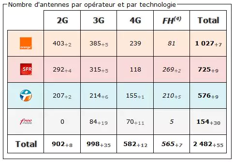 (4) FH (faisceau hertzien) : Système de transmission entre les antennes relais. N’est jamais directement capté par un mobile. (chiffre non comptabilisé dans le total des antennes).