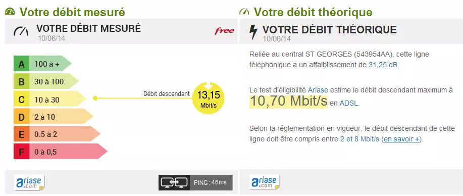 Grâce à cet outil, chacun peut ainsi vérifier s’il bénéficie du meilleur débit disponible à son adresse. Sur la page du site du comparateur, accessible via l’onglet ’Tester mon débit’ du site d’Ariase, il suffit de choisir sur la partie gauche le type de connexion actuellement utilisée. Le test de débit se lance, vérifiant le débit descendant. Sur la partie droite du comparateur, il faut renseigner un numéro de ligne fixe valide pour connaître le débit théorique descendant maximal disponible à l’adresse correspondante. En quelques secondes, l’outil de comparaison d’Ariase affiche à l’aide d’une représentation graphique claire les résultats. L’internaute obtient aussi toutes les informations techniques, avec un résumé de ce que préconise l’ARCEP, pour vérifier que sa connexion ADSL respecte bien le décret du gouvernement sur le sujet du débit descendant.