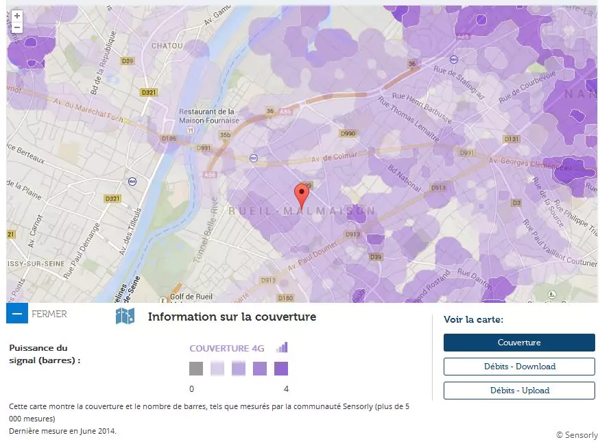 Avec les données de notre partenaire Sensorly Univers Freebox vous propose un focus sur Rueil Malmaison 57 ème ville de France par sa population et vous fait découvrir la carte de la couverture du réseau 4G et des débits.
