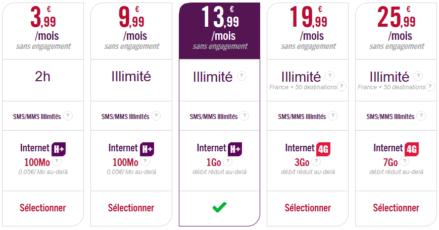 Les autres offres ne bougent pas. Elles varient entre 3,99€/mois pour 2 heures d’appels, les SMS/MMS en illimité et 100Mo de data en H+ et 25,99€/mois pour les appels illimités, les SMS/MMS en illimité et 7 Go de data en 4G.