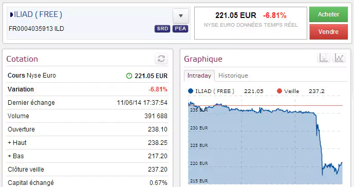 A 20 min de la fermeture de la Bourse, l’action Iliad est en baisse de près de 7%, Bouygues de 6,30%, Orange 3,29% et Numéricable 4,57%.