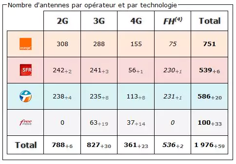 4) FH (faisceau hertzien) : Système de transmission entre les antennes relais. N’est jamais directement capté par un mobile. (chiffre non comptabilisé dans le total des antennes).