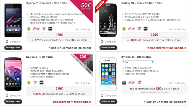 Pour les autres, ce sont des indisponibilités totales qui concernent le Samsung Galaxy S4 Black Edition 16 Go, vendue 399 €, Le Nexus 5 Noir 16 Go, vendu 349 €, et le Huawei Ascend Y330, vendu 69 €.