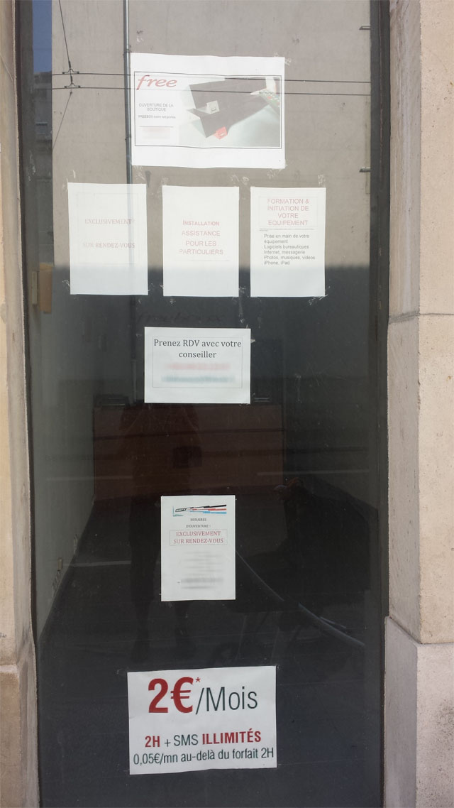 Si à l’intérieur les marques Free et Freebox sont légèrement détournées (en « Fre » et « Freeboox »), sur la vitrine, tout est fait pour faire croire à une boutique Free.