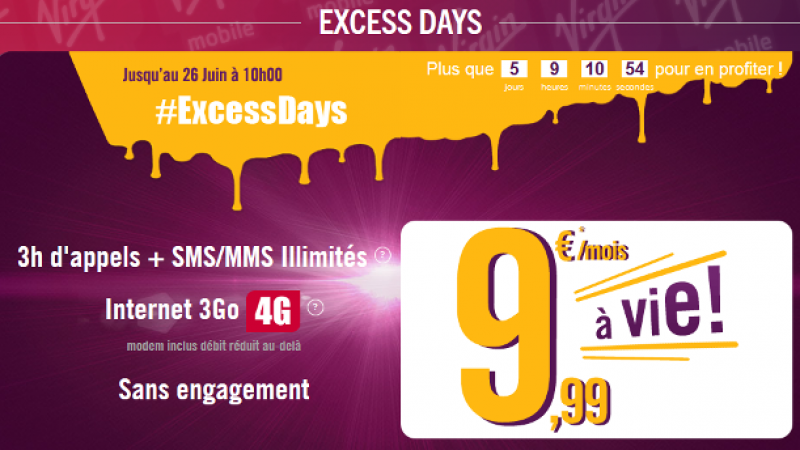 Initialement prévue jusqu’au 30 mai, Virgin Mobile prolonge son opération spéciale « Excess Days ». Cette offre permet de bénéficier d’un forfait 4G sans engagement à un tarif agressif incluant 3h de communication, les SMS/MMS en illimités et 3Go de data en 4G pour 9,99€/mois.
