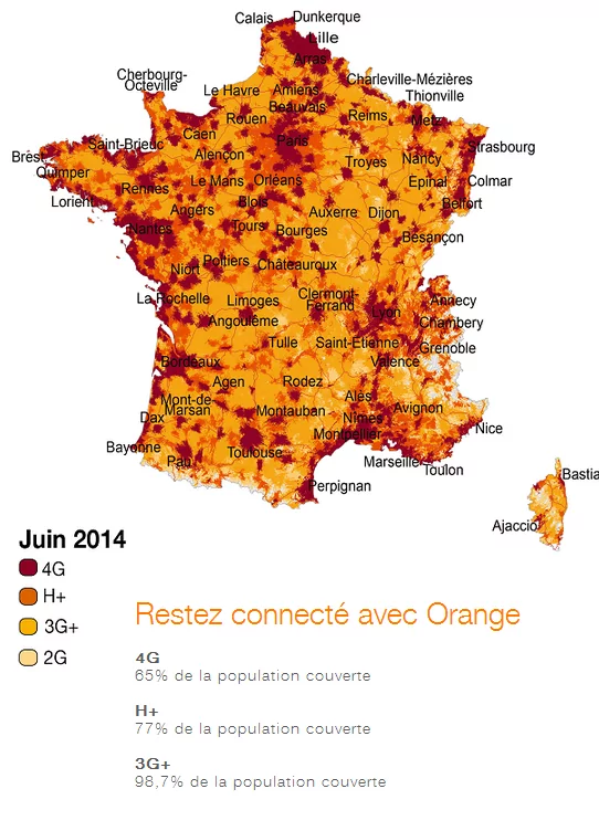 Du côté d’Orange en revanche on se rapproche, on grappille pourcent par pourcent, l’avantage de Bouygues, tiré du refarming 1800 Mhz. Si le mois dernier Orange revendiquait 60 % de la population couverte, 30 jours plus tard c’est 65 % de la population qui est annoncé sous couverture 4G, 77% en H+ et 98,7 % en 3G+.