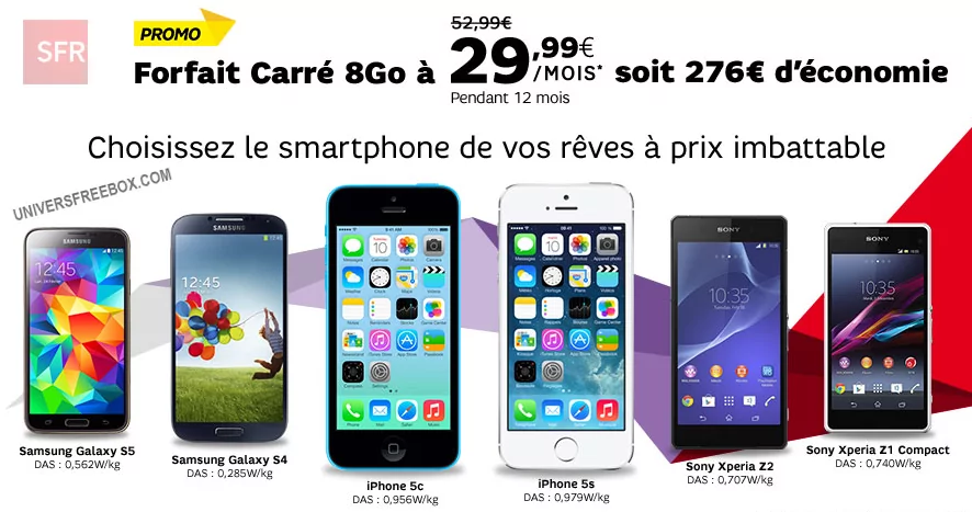 L’offre promotionnelle sera accompagnée d’une sélection de Smartphones à « prix imbattable » : Samsung Galaxy S4 et S5, les iPhone 5c et 5s et les Sony xPeria Z1 Compact et Z2.