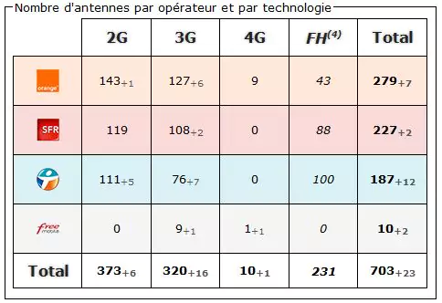 4) FH (faisceau hertzien) : Système de transmission entre les antennes relais. N’est jamais directement capté par un mobile. (chiffre non comptabilisé dans le total des antennes).