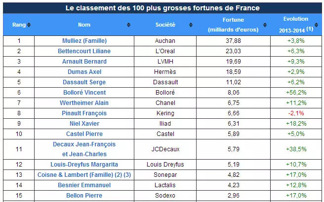 Comme chaque année, le magazine Capital publie le classement des 100 français les plus riches de France. Capital note en introduction que « Les 100 plus grosses fortunes de France ont accumulé un pactole de 257 milliards d’euros en 2014 ! »