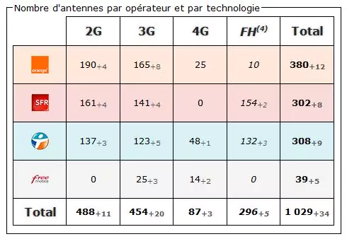 4) FH (faisceau hertzien) : Système de transmission entre les antennes relais. N’est jamais directement capté par un mobile. (chiffre non comptabilisé dans le total des antennes).