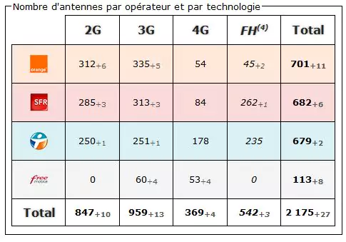 4) FH (faisceau hertzien) : Système de transmission entre les antennes relais. N’est jamais directement capté par un mobile. (chiffre non comptabilisé dans le total des antennes).
