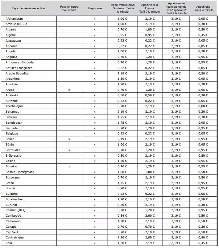 L’opérateur applique cette baisse dès aujourd’hui et vient de mettre à jour sa brochure tarifaire. Cette dernière affiche al liste complète des pays et les nouveaux tarifs qui y sont appliqués. A noter que la facturation est faite par minute indivisible pour les appels émis et reçu depuis l’étranger. Les appels émis depuis les pays soulignés vers la France métropolitaine et les pays soulignés sont facturés au tarif de 0,22 euros TTC par minute facturée à la seconde au-delà des 30 premières secondes indivisibles.
