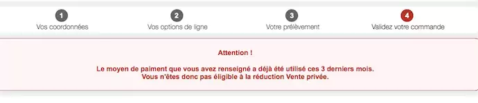 Alors que l’offre Free Mobile, proposée sur Vente Privée à 3,99 €/mois court jusqu’à vendredi matin, certains anciens abonnés voulant profiter de l’offre se retrouvent dans l’impossibilité de se réabonner sous prétexte que "le moyen de paiement que vous avez renseigné a déjà été utilisé ces trois derniers mois. Vous n’êtes donc pas éligibles à la réduction Vente privée."
