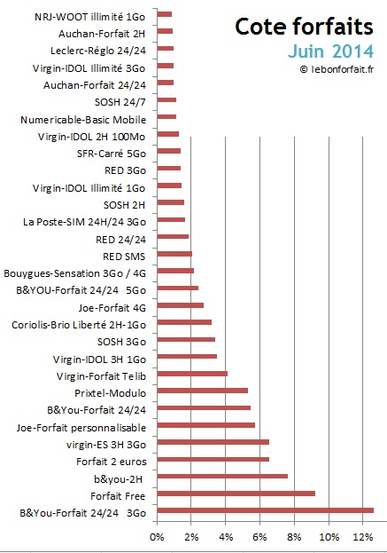 C’est B&You qui, ce mois ci, passe de la 5e à la première place. Sur 35 000 consultations entre le 1er et le 30 juin, B&You récolte 22% des consultations contre 6% le mois précédent. Le site lebonforfait.fr note ainsi que Bouygues à multiplié les promotions sur sa marque low cost, comme l’accès gratuit à le TV sur mobile pendant la coupe du monde, le forfait bloqué offert pour un forfait acheté et les 50 € offert pour une portabilité…