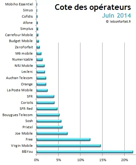 C’est B&You qui, ce mois ci, passe de la 5e à la première place. Sur 35 000 consultations entre le 1er et le 30 juin, B&You récolte 22% des consultations contre 6% le mois précédent. Le site lebonforfait.fr note ainsi que Bouygues à multiplié les promotions sur sa marque low cost, comme l’accès gratuit à le TV sur mobile pendant la coupe du monde, le forfait bloqué offert pour un forfait acheté et les 50 € offert pour une portabilité…