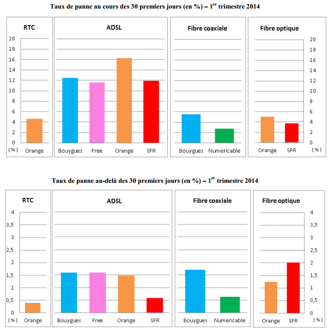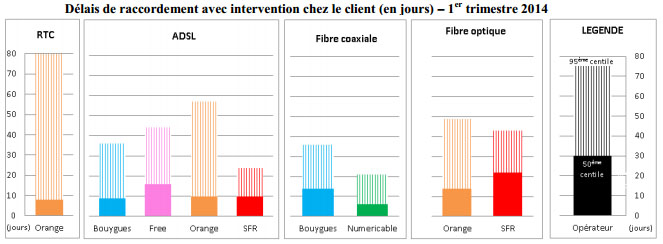 Chaque trimestre, les opérateurs comptant plus de 100 000 abonnés doivent publier, sur leur site internet, pour chaque technologie d’accès (ADSL, réseau téléphonique commuté, FttH, câble), les résultats des mesures de la qualité de leur service fixe. Au total ce sont neuf indicateurs concernant l’accès au réseau des opérateurs et la qualité du service téléphonique qui sont mesurés chaque trimestre.Bouygues Telecom, Darty Box, Free, Numericable, Orange et SFR ont ainsi rendu publics, le 2 juillet, les résultats des mesures effectuées au premier trimestre 2014.