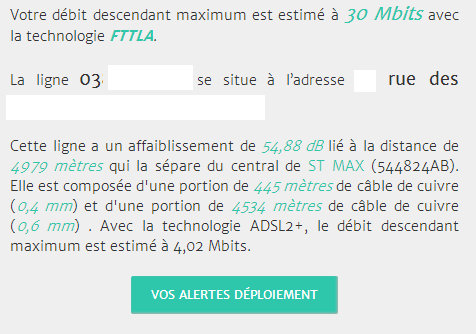 il vous suffit ainsi de renseigner le n° de ligne : ce dernier vous renseigne alors du NRA ou NRO auquel vous dépendez, de la longueur de votre ligne, du nombre de lignes qui dépendent du NRA/NRO, du débit maximum auquel vous pouvez prétendre ainsi que de l’éligibilité aux services de télévision.