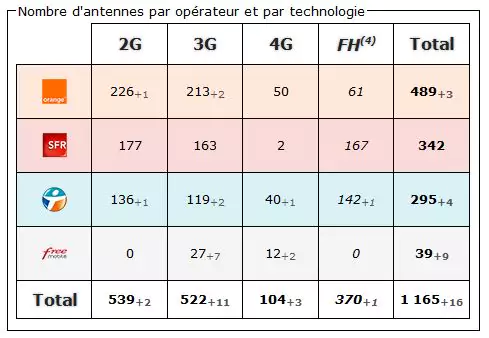 4) FH (faisceau hertzien) : Système de transmission entre les antennes relais. N’est jamais directement capté par un mobile. (chiffre non comptabilisé dans le total des antennes).